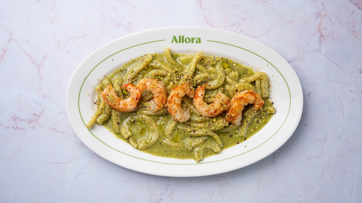 Casarecce, sarkanās Argentīnas garneles, pistāciju pesto