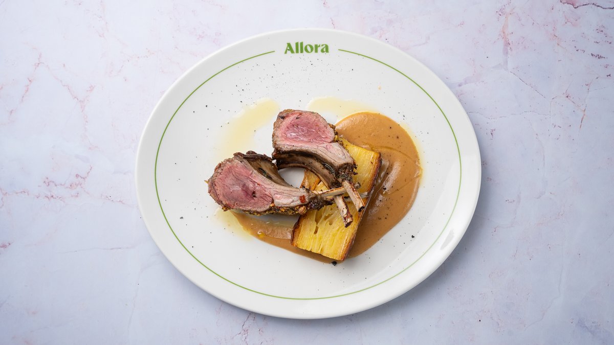 Jēra karē, pistācijas, karamelizētu ķiploku biezenis, Latvijas kartupeļu gratēns, parmezāna siers