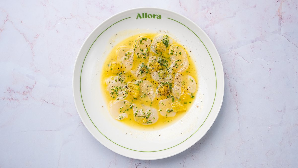 Jūras ķemmīšu crudo, olīveļļas-sarkano apelsīnu mērce, maurloki