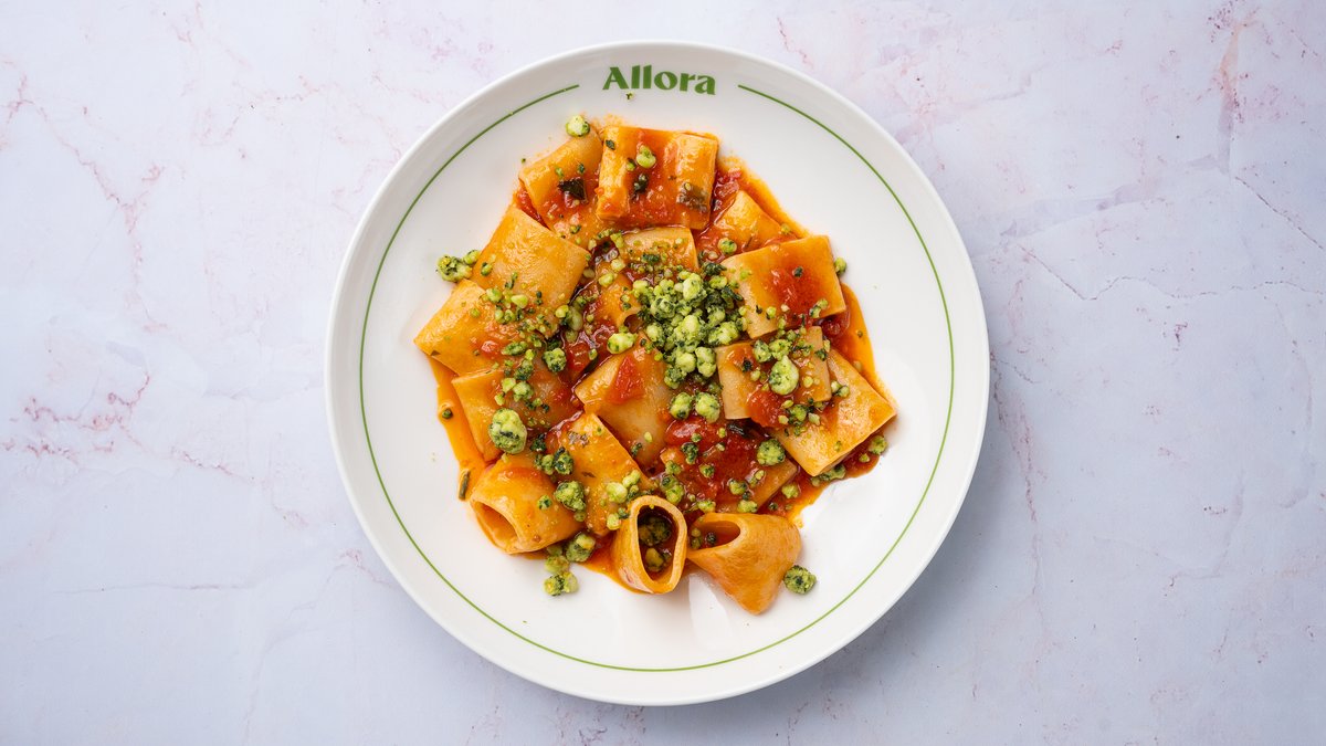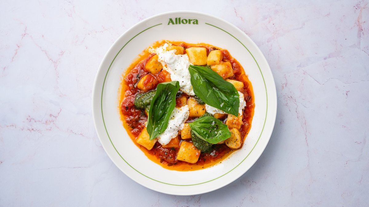 Kartupeļu gnocchi, pomodoro, straciotella, bazilika pesto