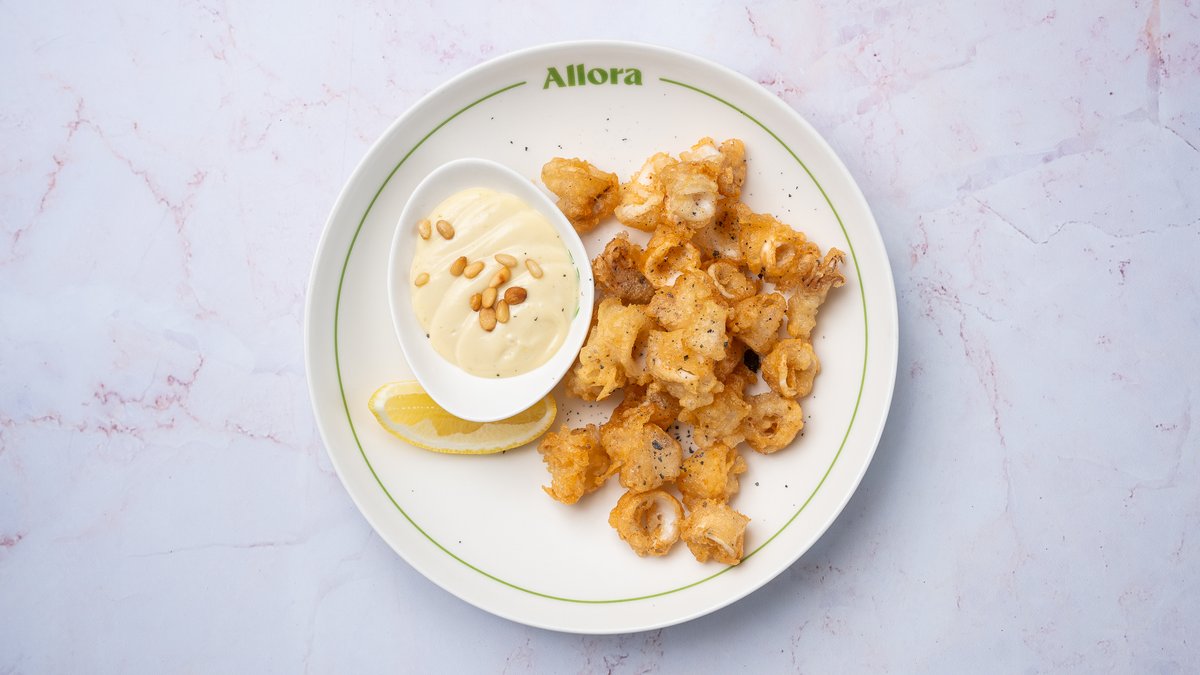Kraukšķīgi mazie kalmāri, ķiploku-citrona aioli, ciedru rieksti, citrons