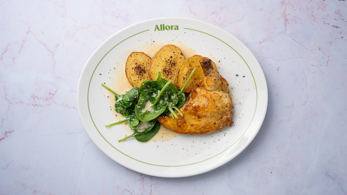 Kukurūzas cāļa fileja, citronu-ķiploku marināde, cepti kartupeļi, blanšēti spināti, krēmīga citronu mērce