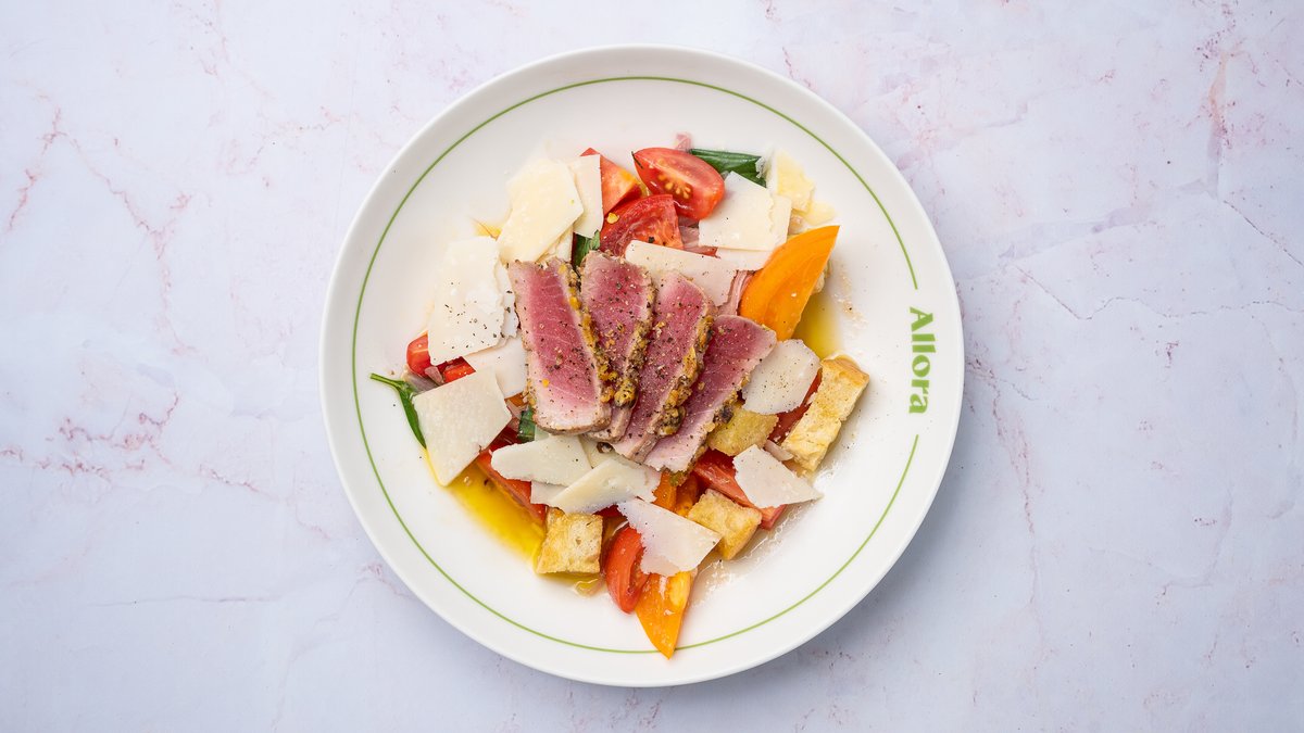 Panzanella salāti, Parmegianoregiano siers, grilēts tuncis, pistācijas