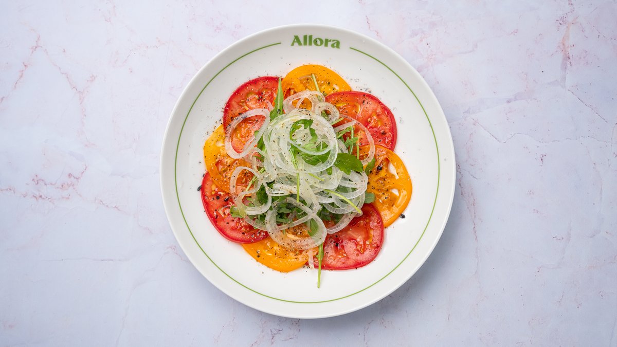 Tomātu variācijas crudo, citronu-olīveļļas mērce, saldie baltie sīpoli