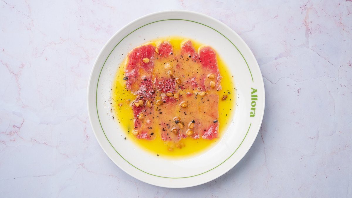 Tunča crudo, citronu-trifeļu eļļas mērce, ciedru rieksti