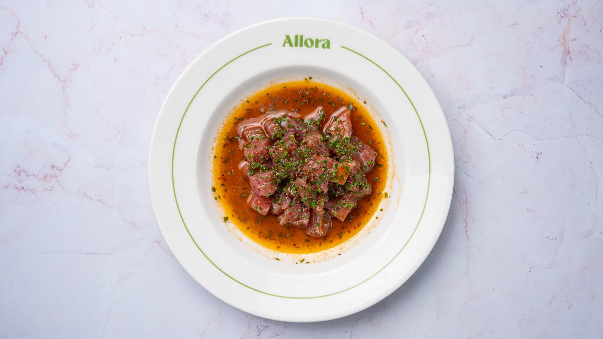 Tunča tartars, peperoncini piccanti ābolu etiķa mērce, maurloki