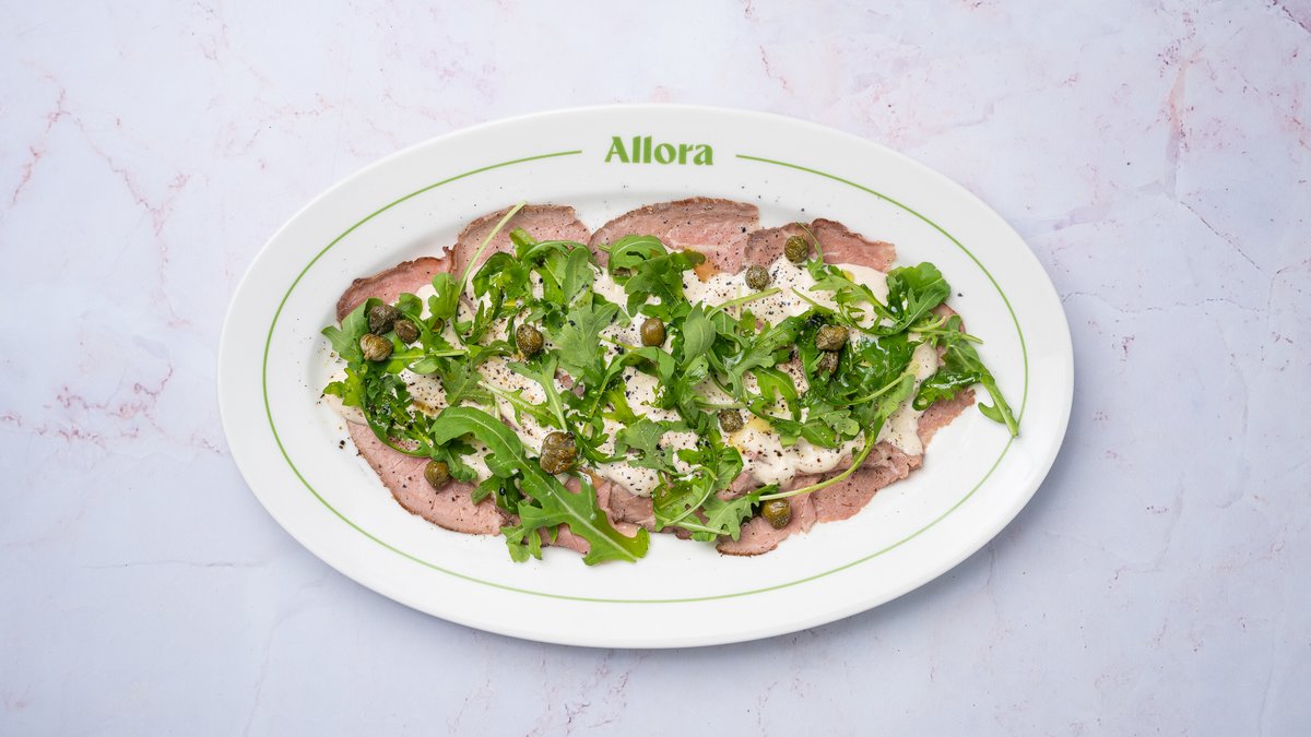 Liellopa karpačo, pecorino siers, ciedru rieksti, rukola
