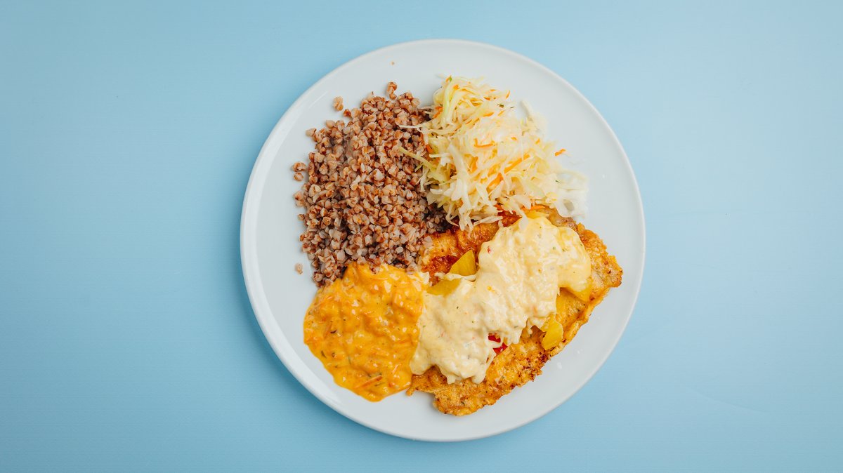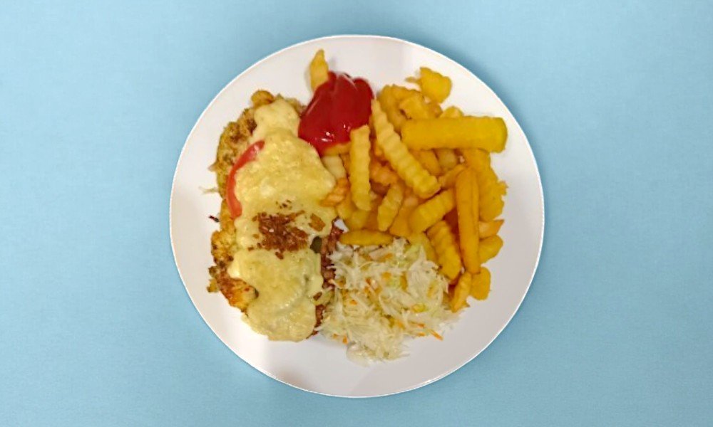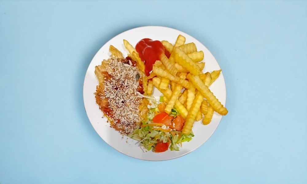 Vistas fileja, kečups, kukurūzas pārslas, siers