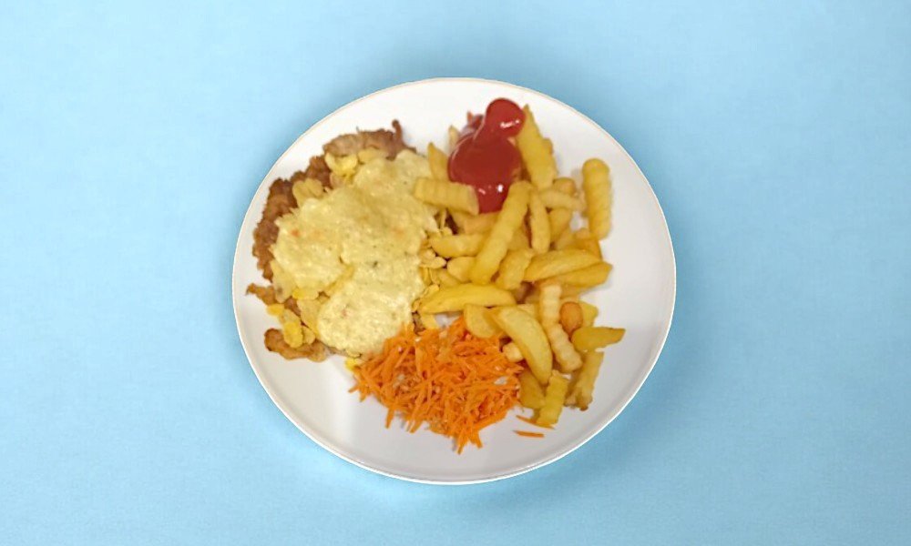 Cūkas karbonāde, kečups, kukurūzas pārslas, siers