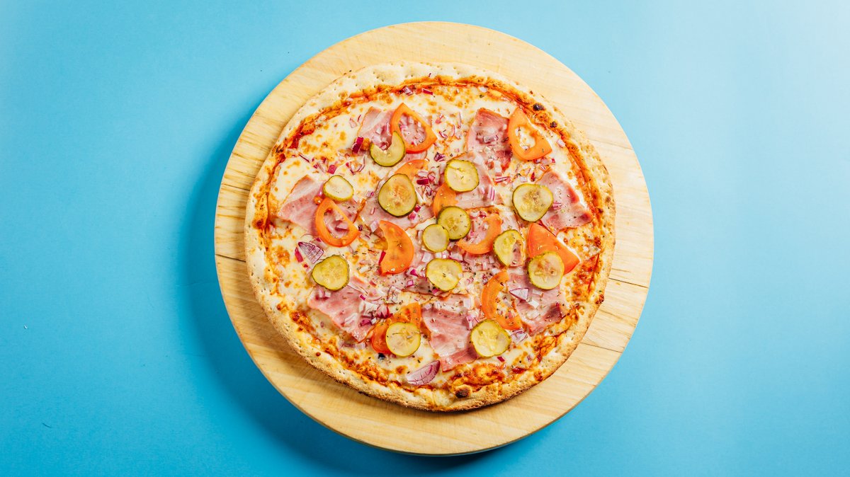 Tomātu mērce, Siers, Bekons, Sīpoli, Svaigi tomāti, Marinēti gurķi, Dilles, Oregano