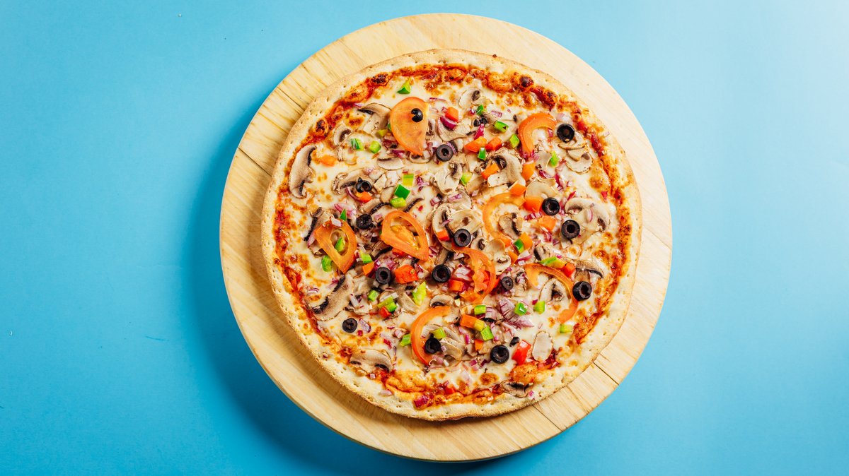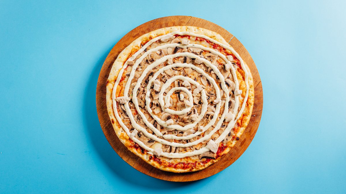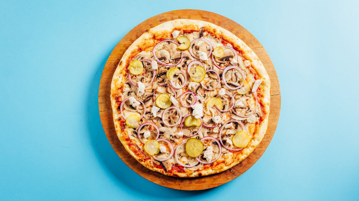 Tomātu mērce, Siers, Sēnes, Vistas gaļa, Sīpoli, Olīvas, Marinēti gurķi, Oregano
