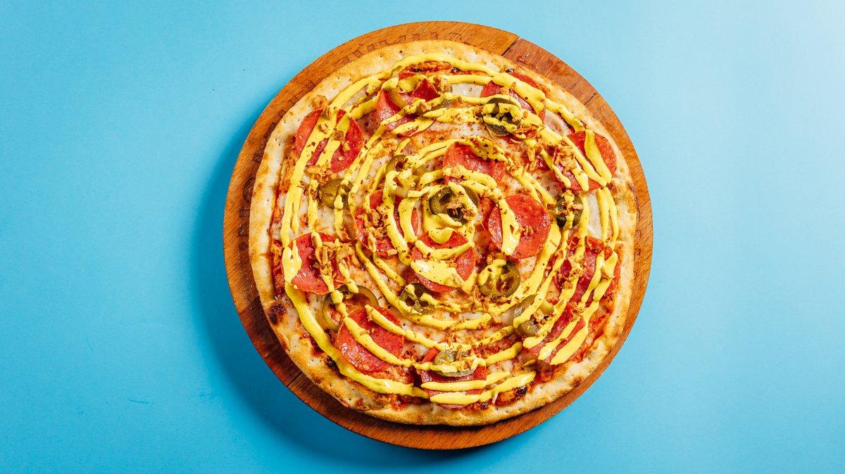 Tomātu mērce, Siers, Asa pepperoni desa, Halapenjo, Karija mērce, Rukola, Cepti sīpoli, Oregano