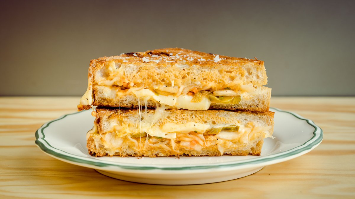 Svaigi cepta ciabatta tostermaizes formā, gauda siers no svaigpiena, jaunpils klasiskais siers, sviests, kimči, halapeno un maldon jūras sāls.
