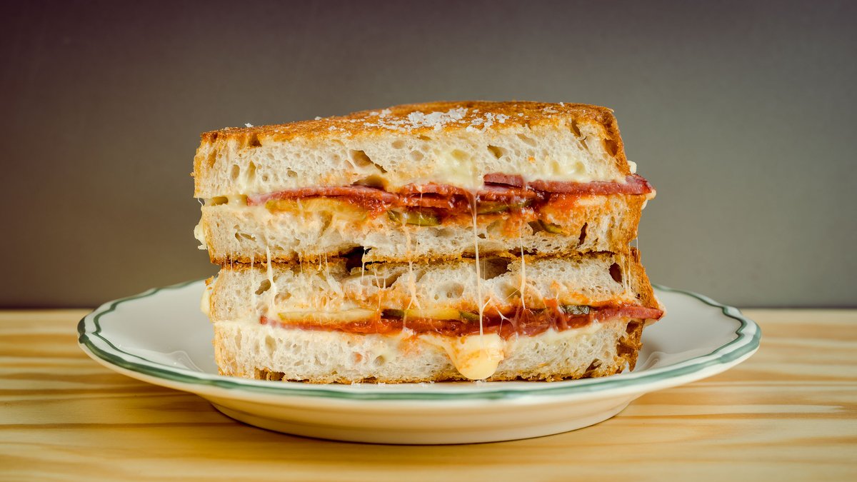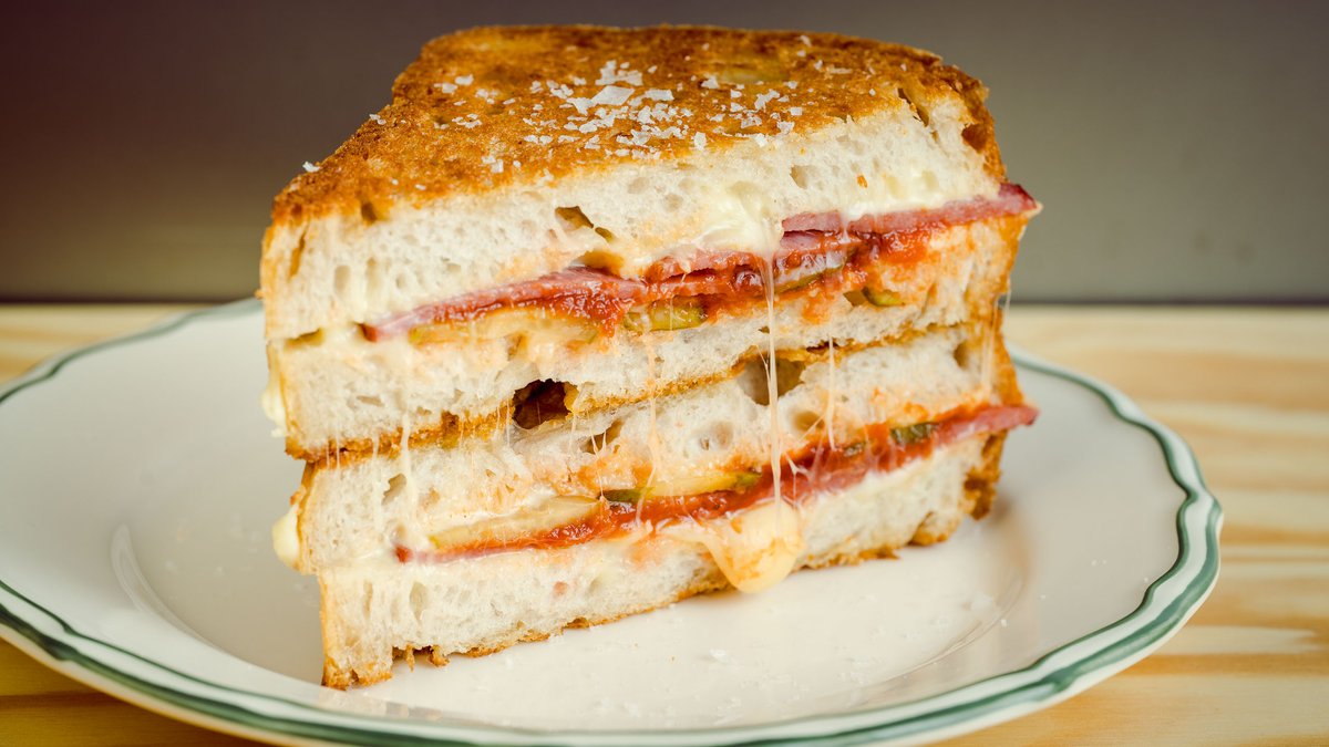 Svaigi cepta ciabatta tostermaizes formā, soira siers no svaigpiena, smiltenes klasiskais siers, sviests, marinēts gurķis, bio tomātu mērce, salami desa un maldon jūras sāls.