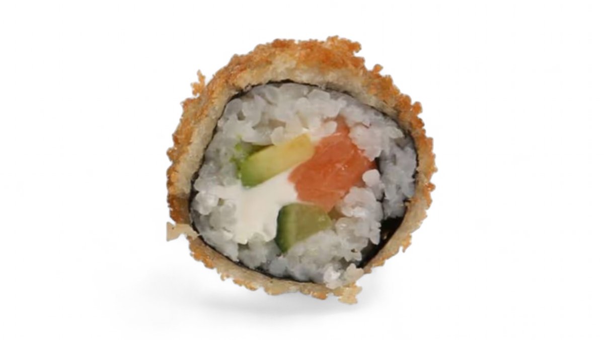 Lasis, krabju nūjiņas, masago ikri, gurķis, loki, tempura, krēmsiers, teriyaki un karai mērce
