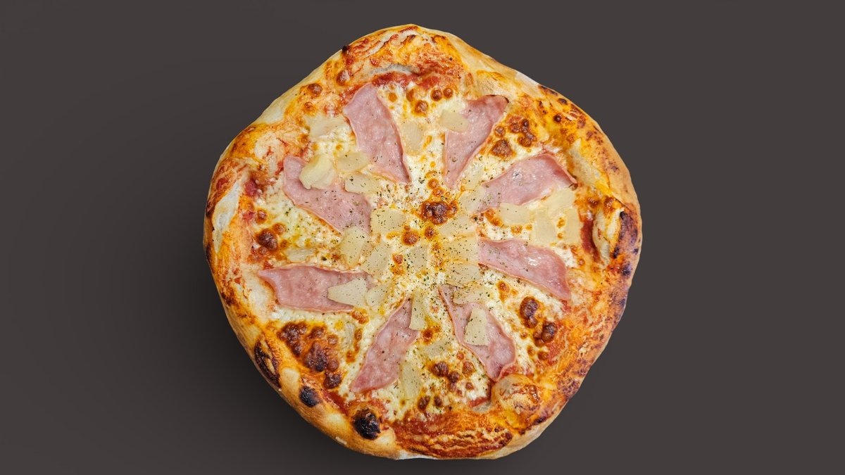 Picas mērce, Mozzarella, Vārīts šķinķis, Ananāsi, Oregano, Garšaugu eļļa