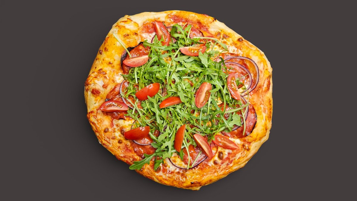 Picas mērce, Mozzarella, Sarkanie sīpoli, Čorizo, Rukkola, Ķiršu tomāti, Oregano, Garšaugu eļļa