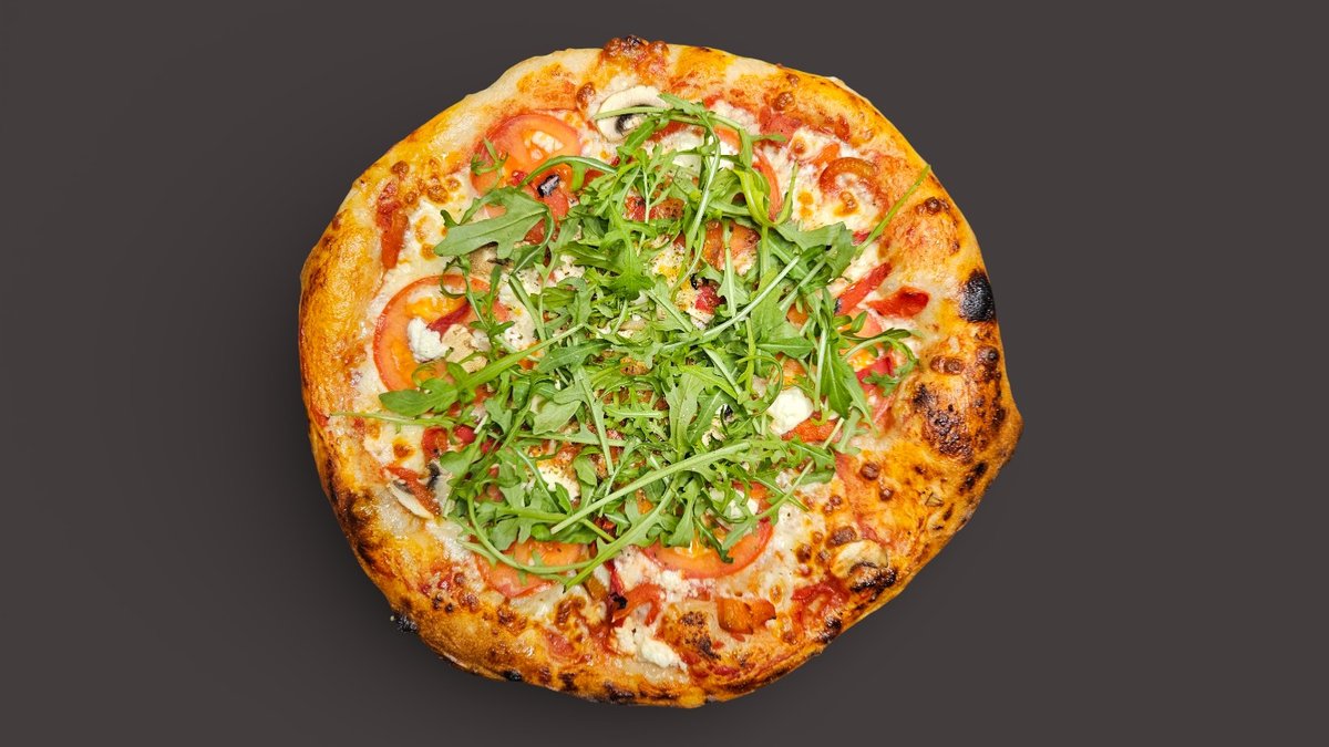Picas mērce, Mozzarella, Tomāti, Grillēta paprika, Šampinjoni, Svaigais siers, Oregano, Garšaugu eļļa