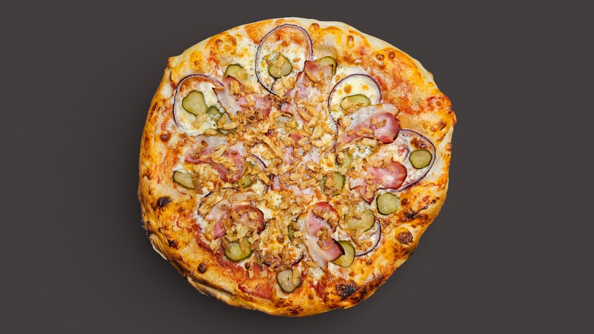 Picas mērce, Mozzarella, Sarkanie sīpoli, Marinēti gurķi, Bekons, Grauzdēti sīpoli, Oregano, Garšaugu eļļa