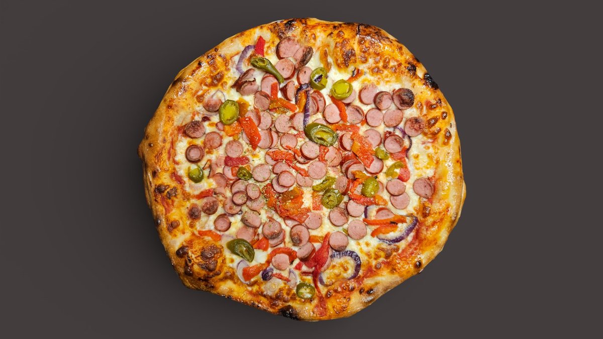 Picas mērce, Mozzarella, Sarkanie sīpoli, Grillēta paprika, Desiņas, Halapenjo, Oregano, Garšaugu eļļa