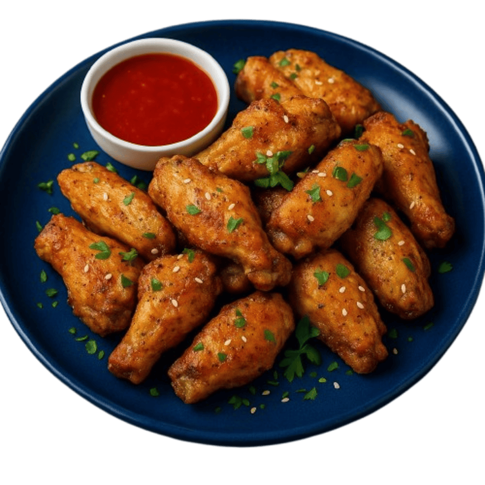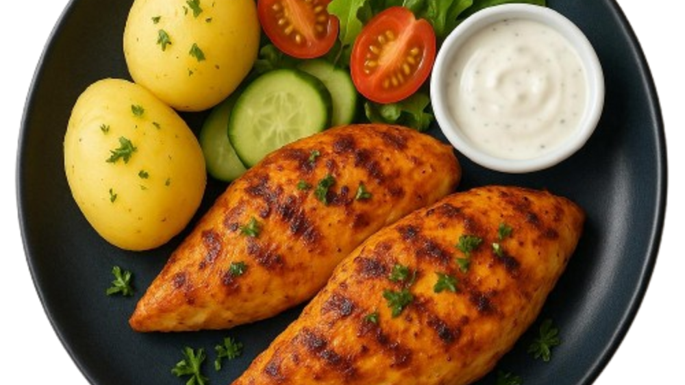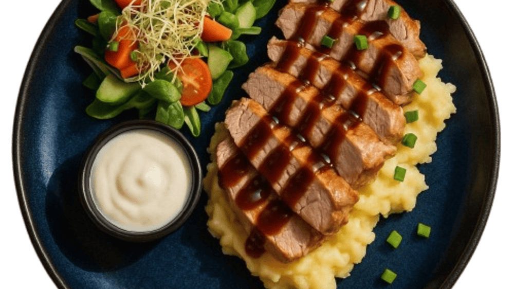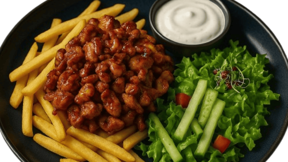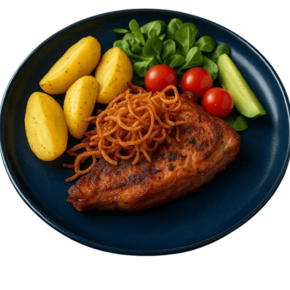 Cūkgaļa BBQ marinādē, svaigs gurķis, siers, karamelizēti sīpoli, svaigi sarkanie sīpoli, salātlapa, majonēze, BBQ mērce un frī kartupeļi.