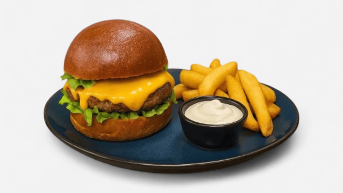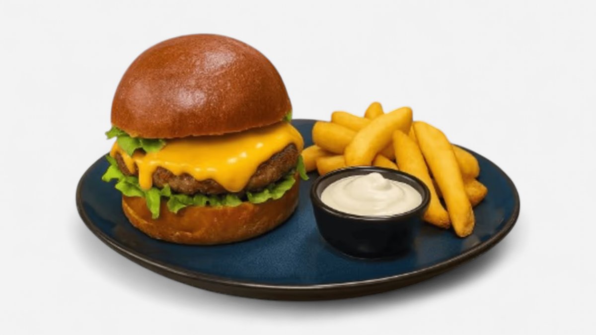 Liellopa gaļa, siers, bekos, salātu lapa, marinēts gurķis, BBQ mērce