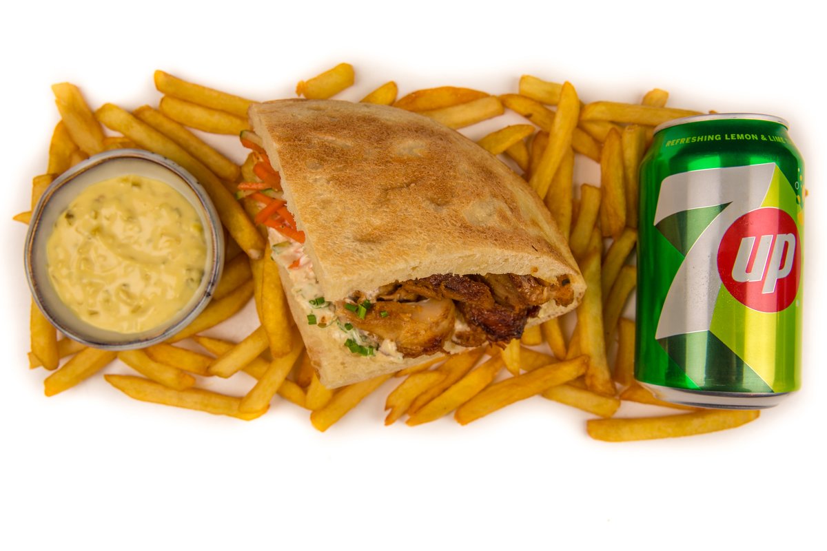 Pita, frī kartupeļi, mērce pēc izvēles, dzēriens pēc izvēles.