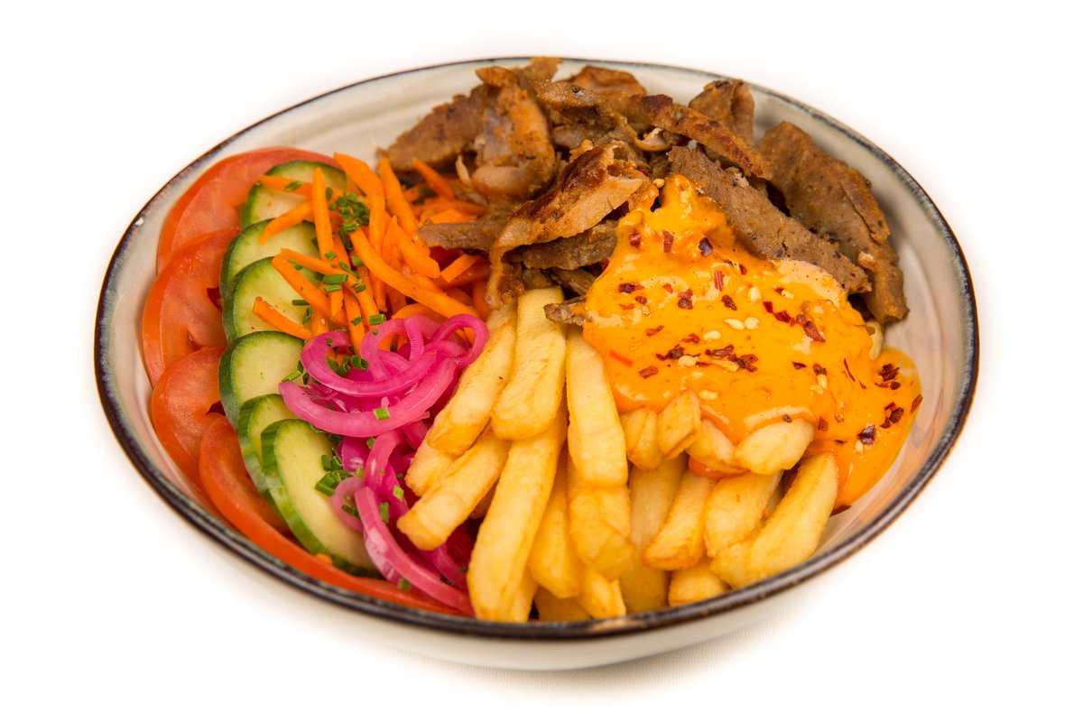 Pēc jūsu izvēles; vista, liellopu gaļa, mix vai falafels, kartupeļi, ļoti asa mērce, maurloki.