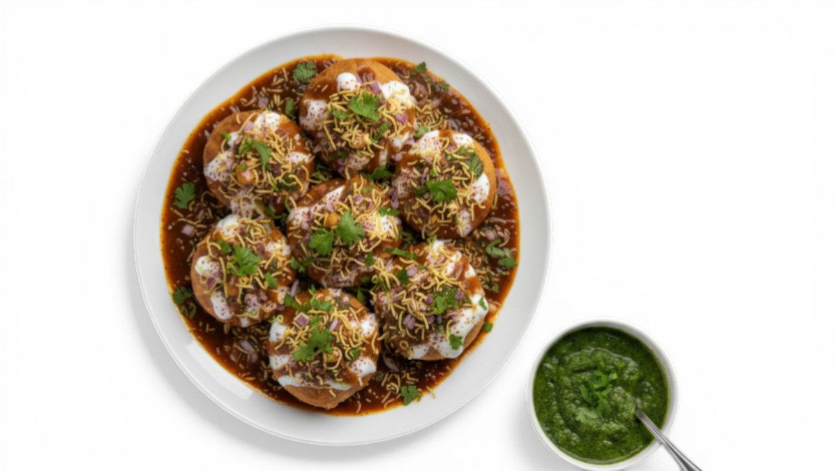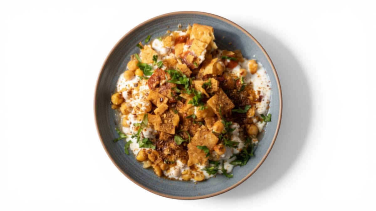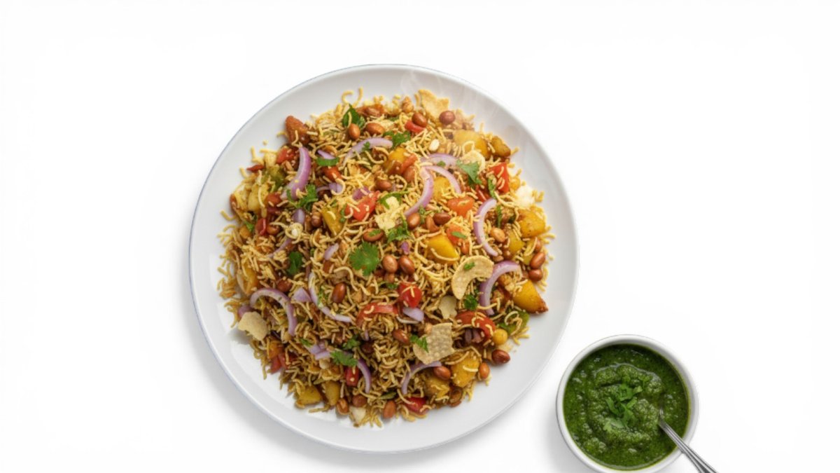 Čaat ar kraukšķīgām puri, kartupeļiem, turku zirņiem, saldo jogurtu un košām mērcēm