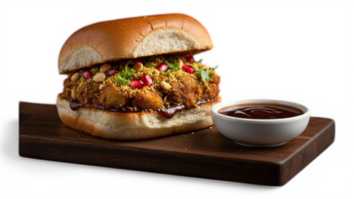Klasisks indiešu ielu ēdiens – pikanta fritēta kartupeļu kotlete mīkstā maizītē ar čatnijiem