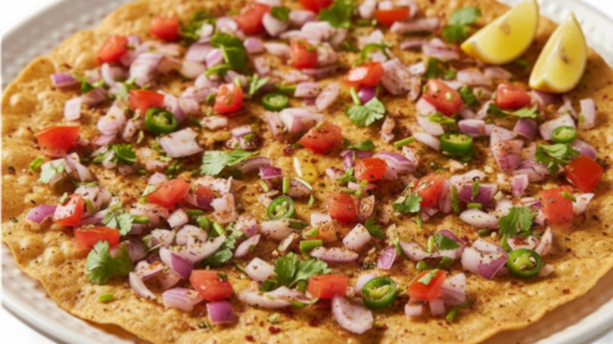 Kraukšķīga lēcu plāksne ar sīpolu, tomātu un garšvielu maisījumu