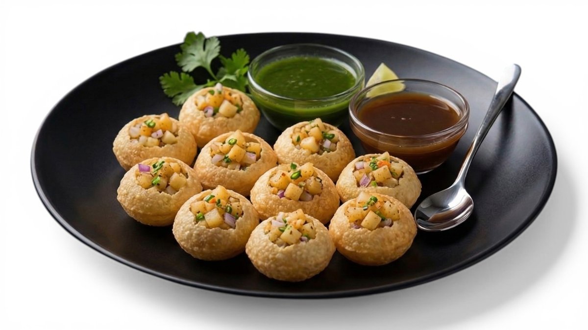 Kraukšķīgas, dobās puri bumbiņas ar pikantiem kartupeļiem, turku zirņiem un atsvaidzinošu piparmētru un tamarinda ūdeni
