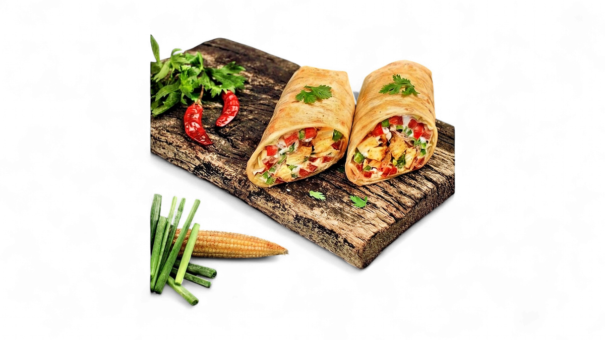 lVeģetārā versija ar karija kartupeļu biezeni, ceptu ziedkāpostu un turku zirņiem, sīpoliem, ietīta siltā tortiljā