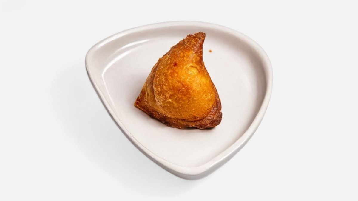 Kraukšķīga zeltaini brūna mīkla, kas pildīta ar garšvielām, zirņiem un aromātiskajām zaļumiem, fritēta