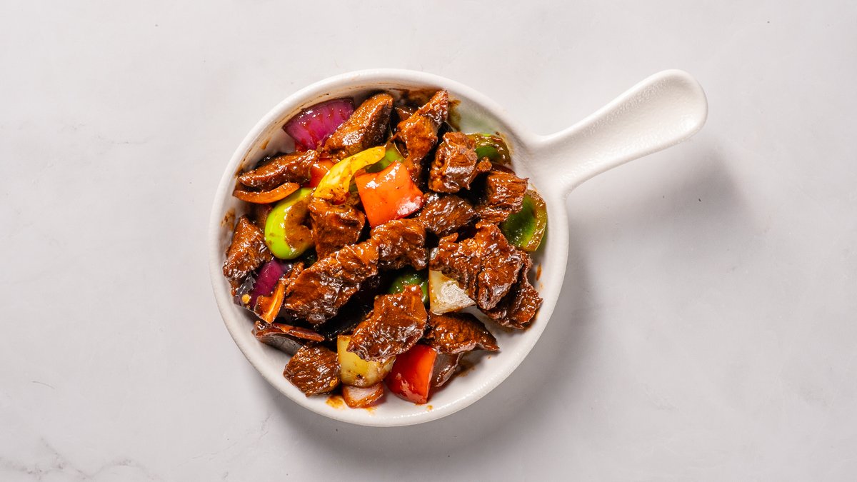Maiga liellopu gaļa, marinēta spilgtā garšvielu maisījumā, aplieta ar saldskābu, skābu un pikantu mērci un mētāta ar sīpoliem, ķiplokiem, ingveru, lociņiem un papriku.