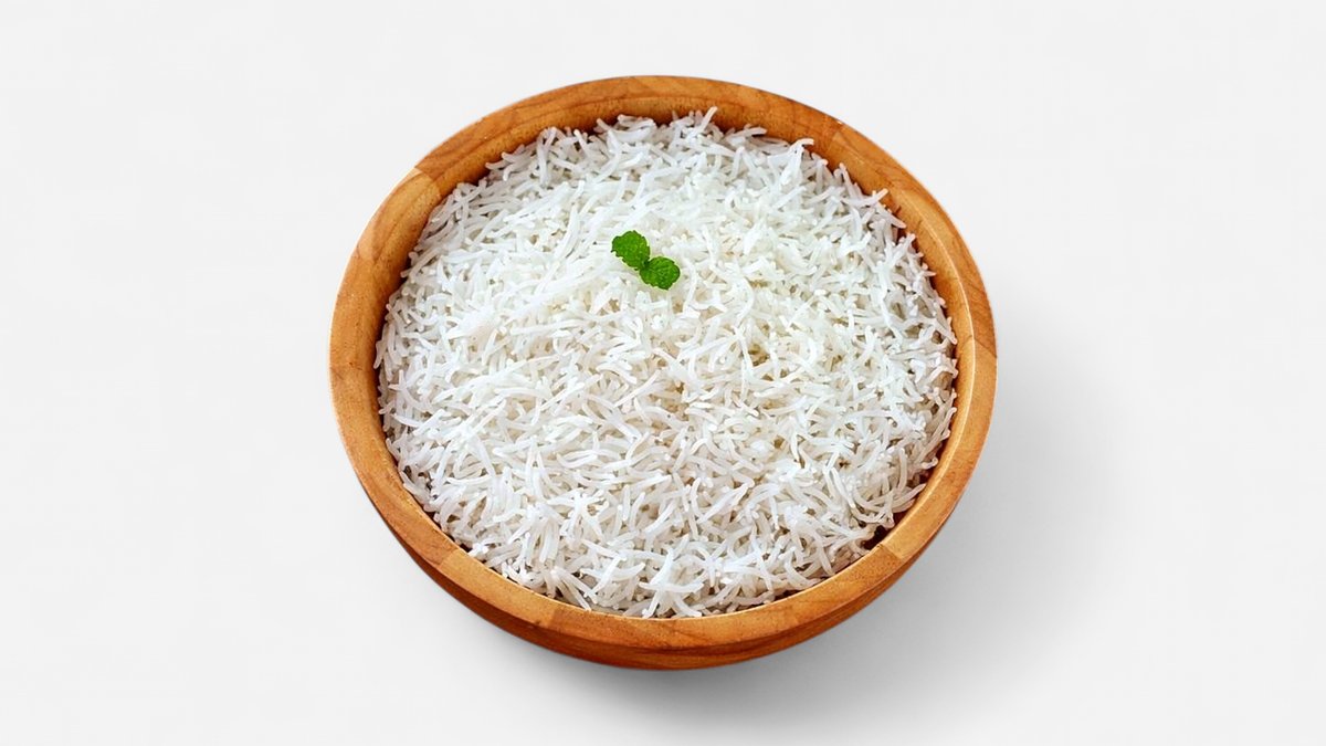 Svaigi pagatavoti basmati rīsi, pasniegti ar trīs dārzeņu kariju un vistas kājiņām mērcē.