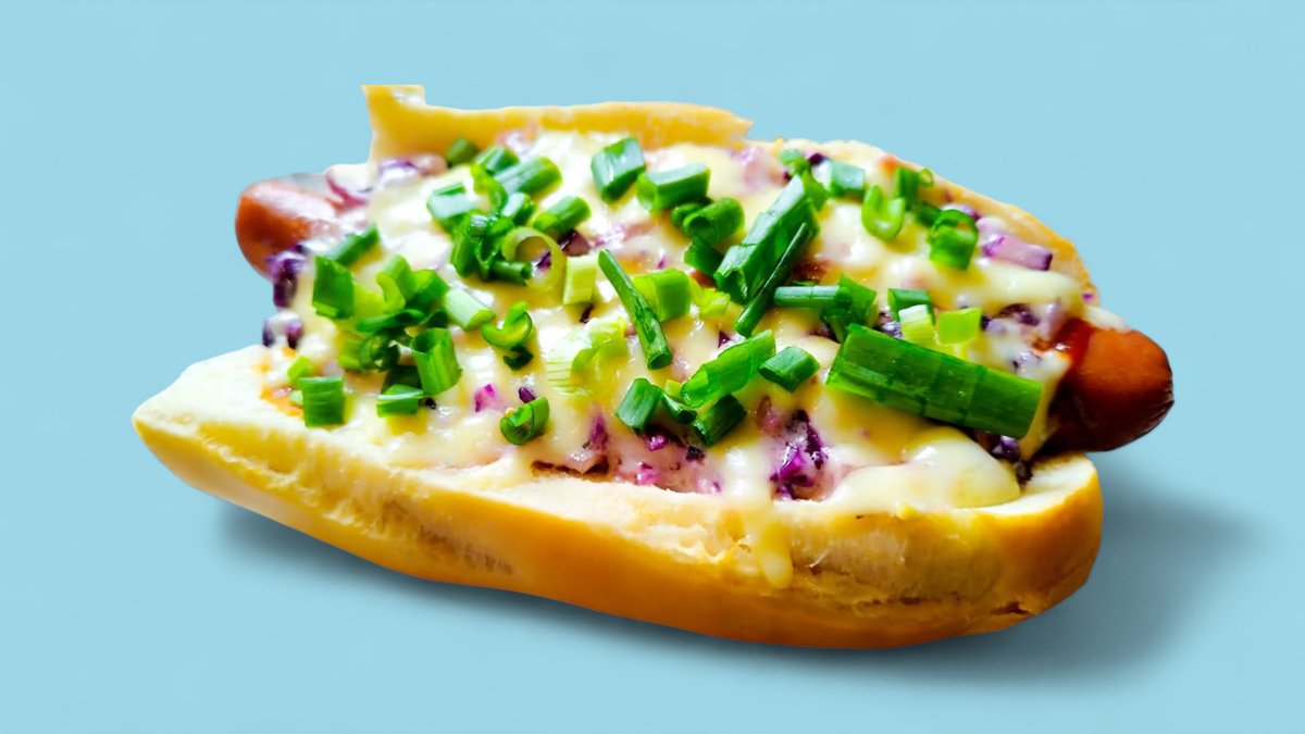 Svaigi cepta hotdog maize, ķiploku sviests, vistas gaļas desiņa, divu veidu siers, bekons, kečups, majonēze