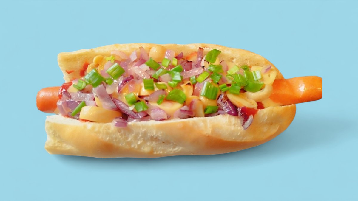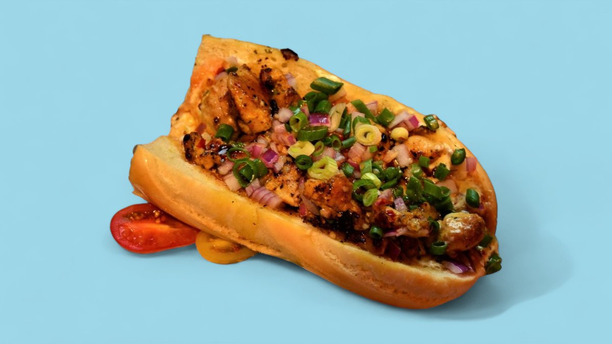 Svaigi cepta hotdog maizīte, vistas giross, ķīnas kāposts, sīpoli, baltā bbq mērce, saldā čillī mērce, zaļumi
