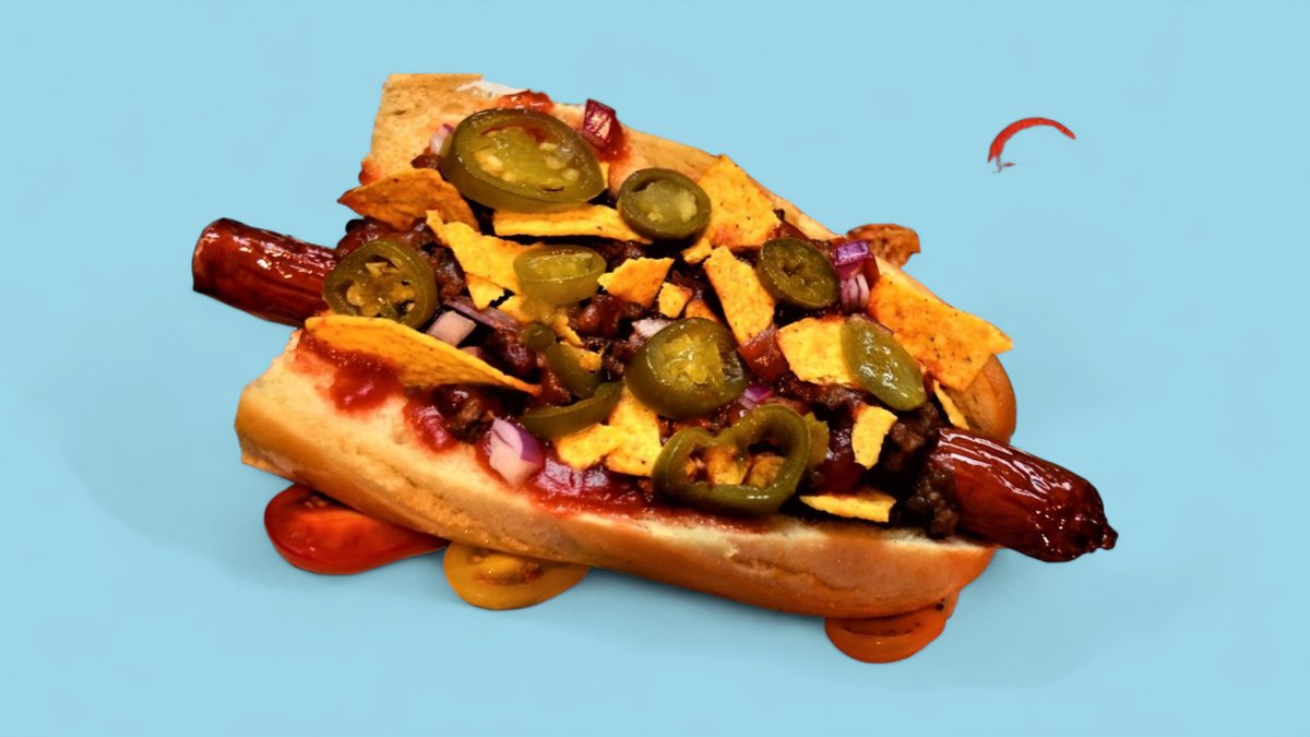 Svaigi cepta hotdog maize, mednieku desiņa, liellopa maltā gaļa, pupiņas, sīpols, halapeno, tomātu mērce. načos čipši
