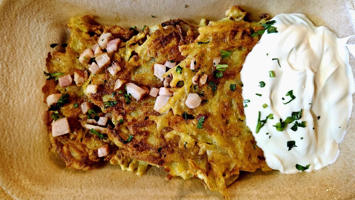 Kartupeļu pankūkas ar krējumu un kūpinātu cūkgaļu