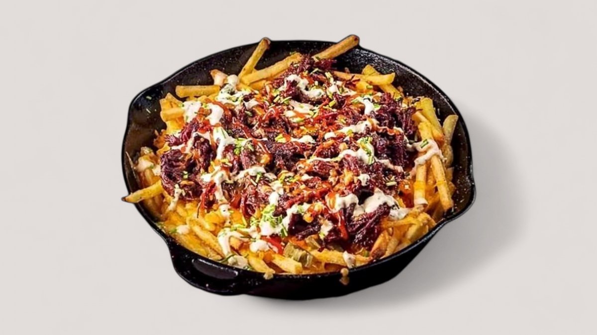 Kartupeļi ar plucināto cūkgaļu, BBQ mērci, čedaras mērci un jalapeño