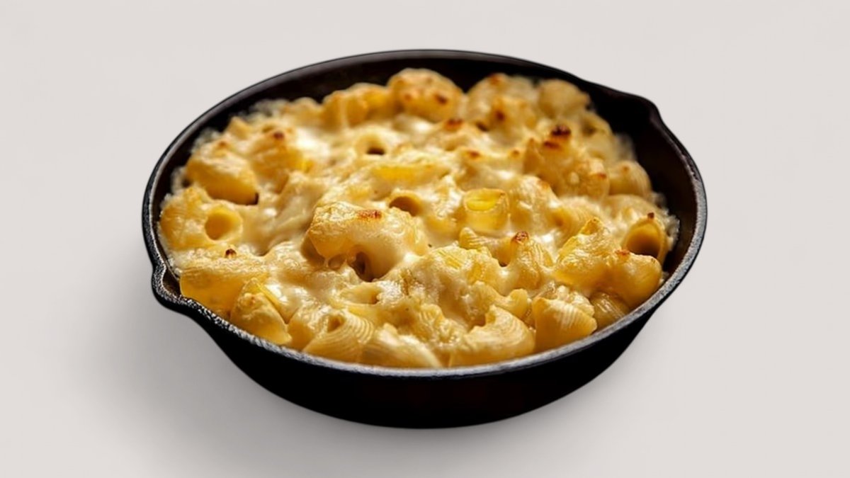 Makaroni, siera mērce, siers, cietais siers, kraukšķīgi sīpoli, lociņi