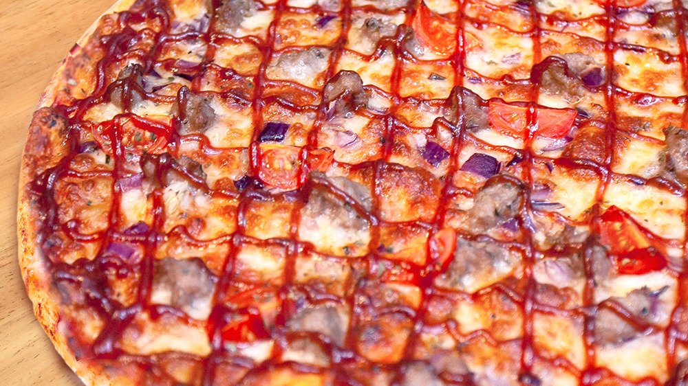 tomātu mērce, siers, bekons, šķiņķis, marinēti sīpoli, kukurūza