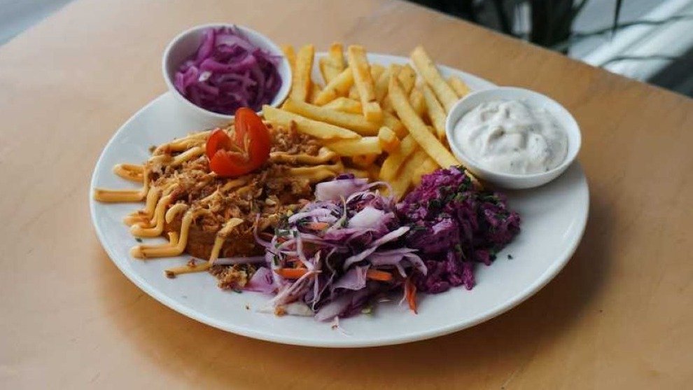 Plucinātas Cūkgaļas ar frī, marinētiem sīpoliem, coleslaw un biešu salātiem Alergēni: 3, 6, 7, 9, 10