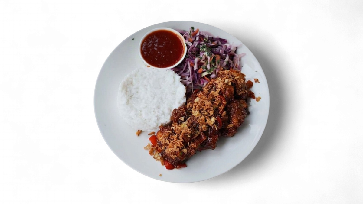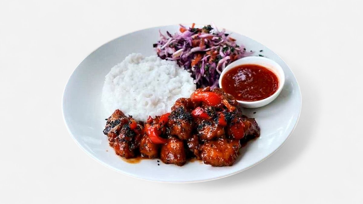 Vistas filejas gabaliņi sojas-medus mērcē ar basmati rīsiem un coleslaw salātiem