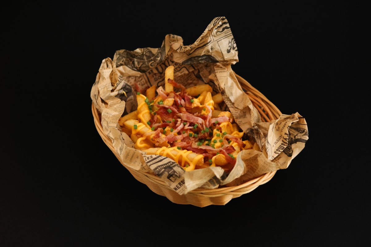 "Dirty fries" ar kraukšķīgiem sīpoliem, Čedaras siera mērci, halapenjo un bekonu