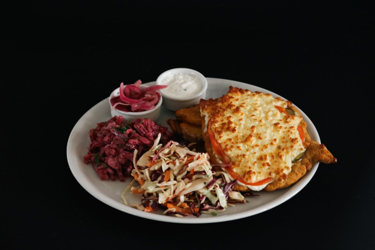 Vistas gaļas karbonāde Ezīša gaumē ar vārītiem-ceptiem kartupeļiem, marinētiem sīpoliem, coleslaw un biešu salātiem