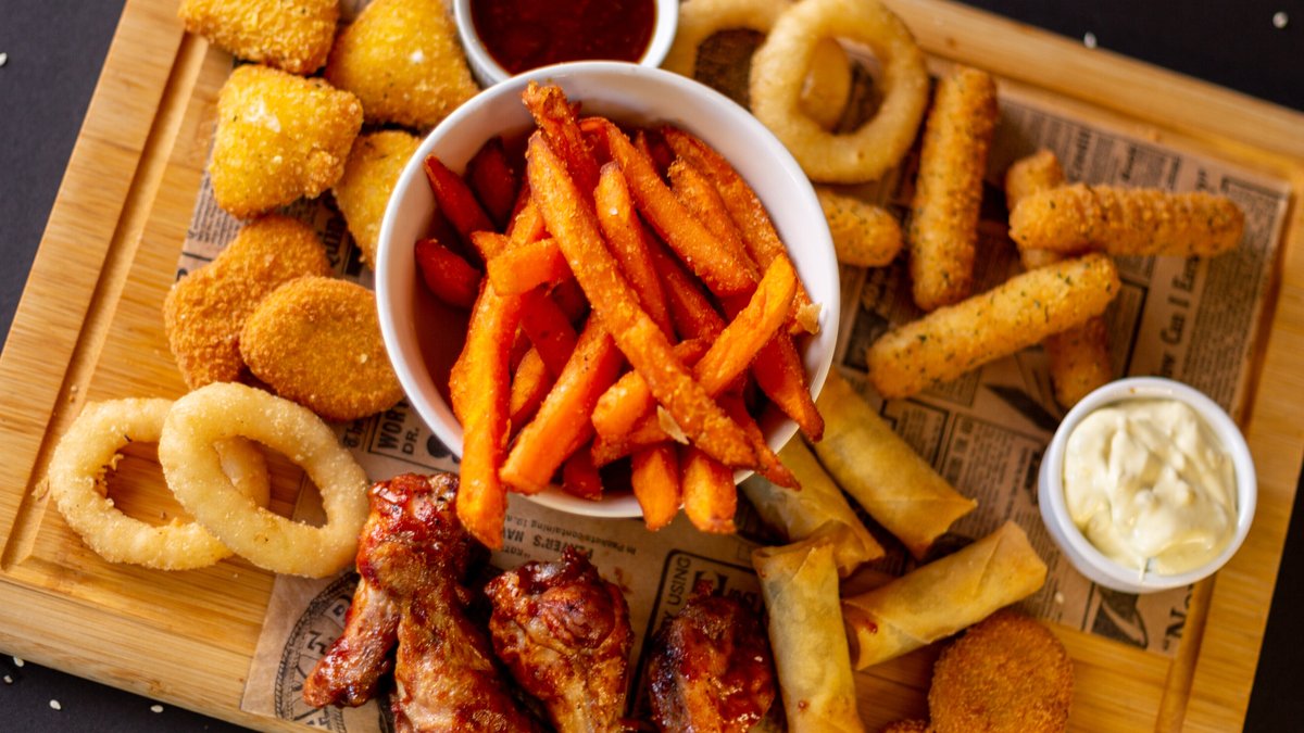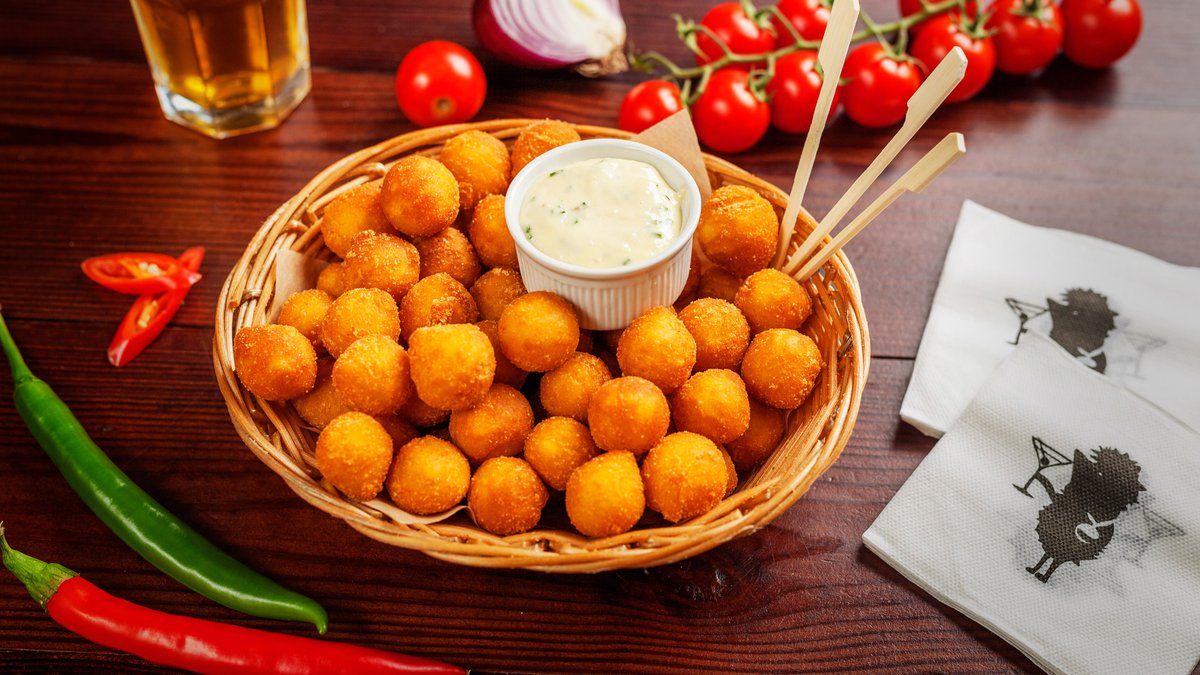 /MAC AND CHEESE NAGETI, MOCARELLA STANDZIŅAS, VISTU SPĀRNIŅI, SALDO KARTUPEĻU FRĪ, VISTAS NAGETI, SPRING ROLLS, SĪPOLU GREDZENI, GURĶU MĒRCE, BBQ MĒRCE/