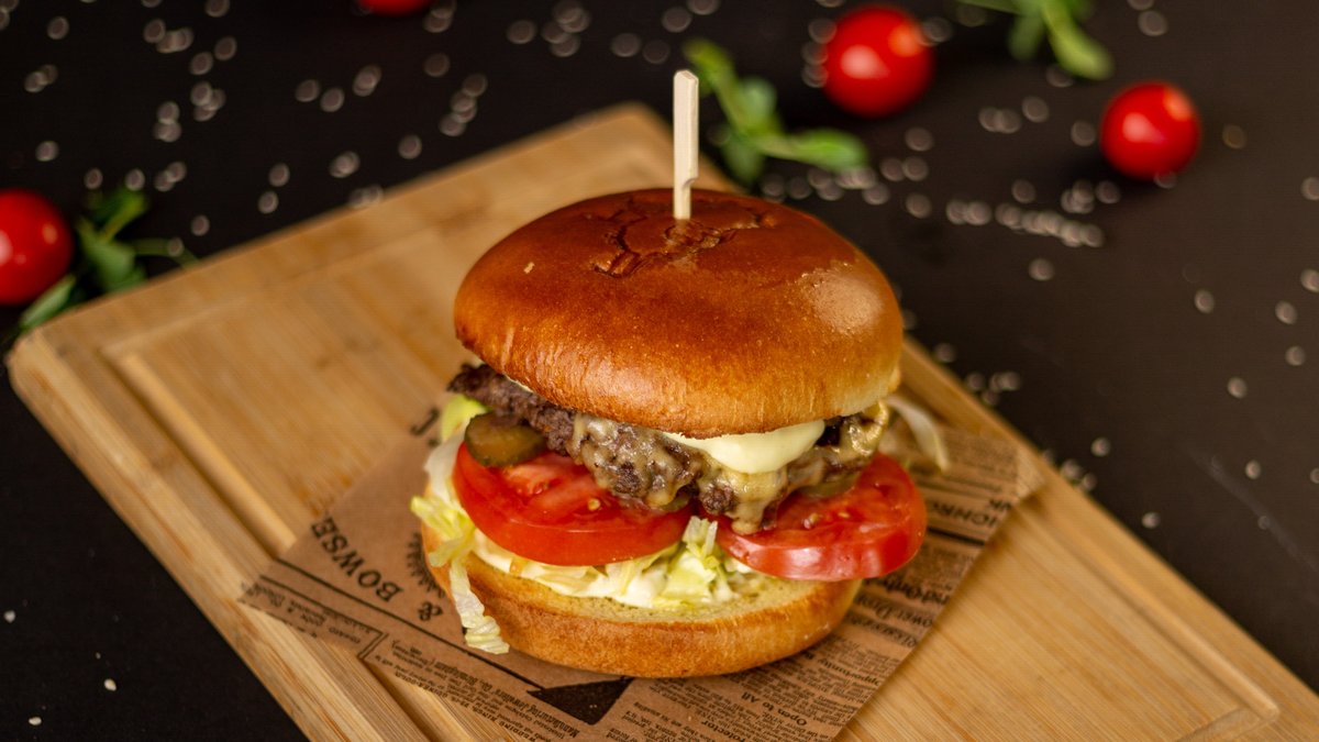 /LIELLOPA GAĻAS KOTLETE, ČEDARAS SIERS, TOMĀTS, MARINĒTS GURĶIS, KARAMELIZĒTI SĪPOLI, LEDUS SALĀTI, GURĶU MĒRCE/