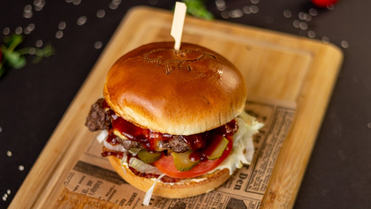 /LIELLOPA GAĻAS KOTLETE, ČEDARAS SIERS, BEKONS, TOMĀTS, MARINĒTS GURĶI, LEDUS SALĀTI, BBQ MĒRCE, MARINĒTI SĪPOLI, GURĶU MĒRCE/